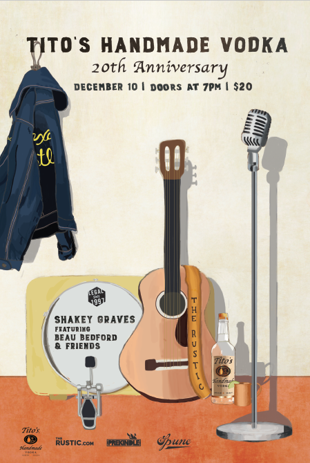 Join The Rustic for Tito’s Handmade Vodka 20th Anniversary featuring Shakey Graves on December 10, 2017. Doors open at 7pm. This event is all ages.