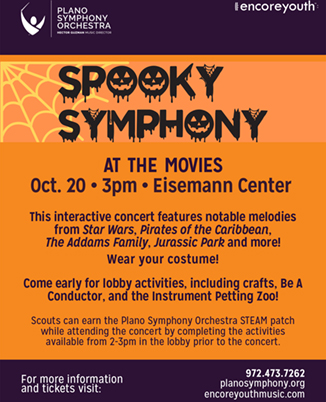 The Plano Symphony Orchestra's "Spooky Symphony at the Movies" is a fun Halloween concert for children 3 - 12 and their families. Numerous pre-concert activities take place in the lobby prior to the concert starting at 2:00 pm. Activities include arts and crafts, the conductors station, the Instrumental Petting Zoo, and the Plano Symphony Orchestra's STEAM fun patch, which can be earned by exploring sound production even making a double reed. Children and adults are encouraged to wear their favorite costumes. The interactive concert features movie favorites from Star Wars, Pirates of the Caribbean, The Addams Family, Jurassic Park and more.
