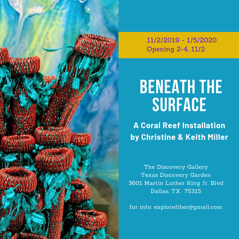 The Coral Reef installation is a collaborative exhibit with Christine Miller, a visual arts educator and life long textile artist and her husband Keith. Keith is creating 2D resin art that will provide the backdrop of being under water for the exhibit. Christine is working on 3D fiber sculptural works that will be representative of coral forms. She is using many fiber techniques and processes such as crochet, felting, stitching, and weaving with wire and yarn. The exhibit will be on display at The Discovery Gallery at Texas Discovery Gardens located in Fair Park in Dallas, TX. The opening is November 2, 2019 from 2:00 – 4:00 p.m. The artwork will be available for sale for the duration of the installation. For more information about the exhibit, you can email Christine at [email protected].