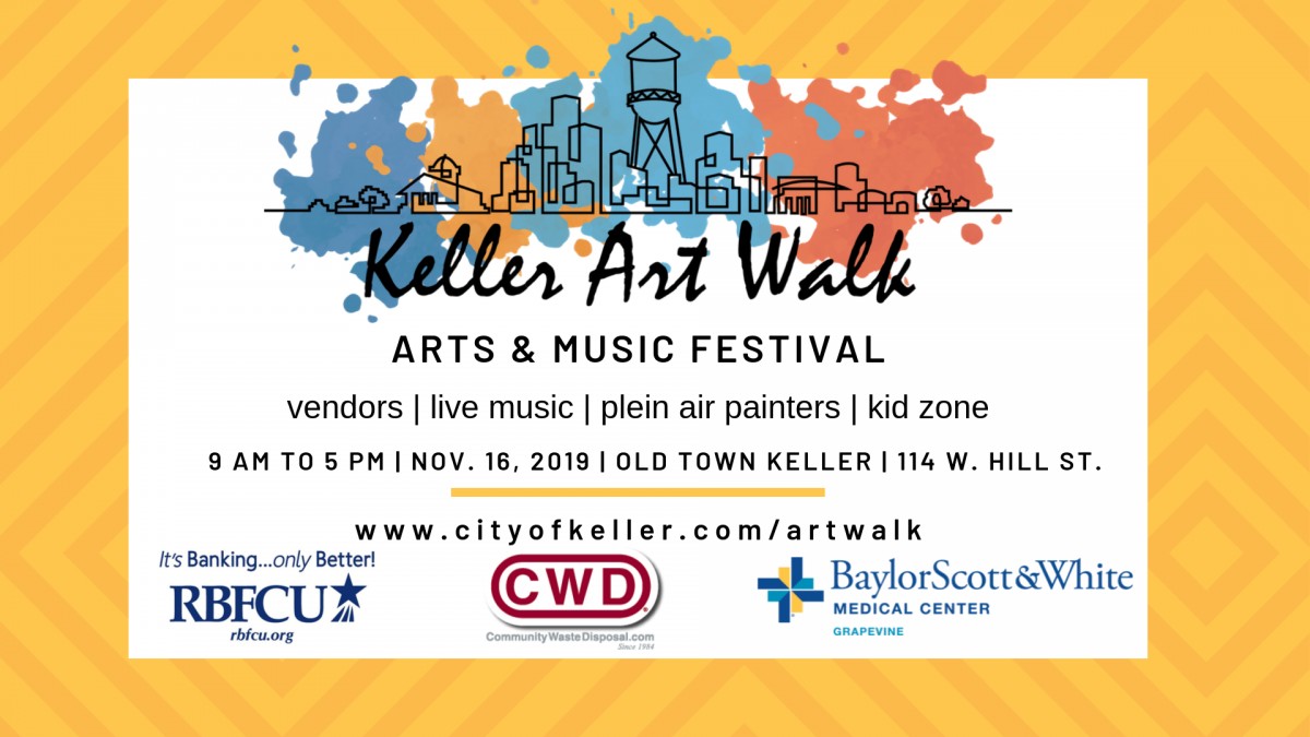 Mark your calendars for the Third Annual Keller Art Walk, Nov. 16th; 9 am - 5 pm. Enjoy the fall weather in Old Town Keller West for this growing event. Many art vendors, plein air artists, musicians, performers, will be on hand, along with a kid zone for the children.