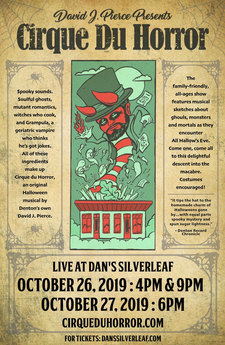 Spooky sounds. Soulful ghosts, mutant romantics, witches who cook, and Grampula, a geriatric vampire who thinks he’s got jokes. All these ingredients make up Cirque du Horror, an original Halloween musical by Denton’s own David J. Pierce. The family-friendly, all-ages show features musical sketches about ghouls, monsters and mortals as they encounter All Hallow’s Eve. Come one, come all to this delightful descent into the macabre. Costumes encouraged.