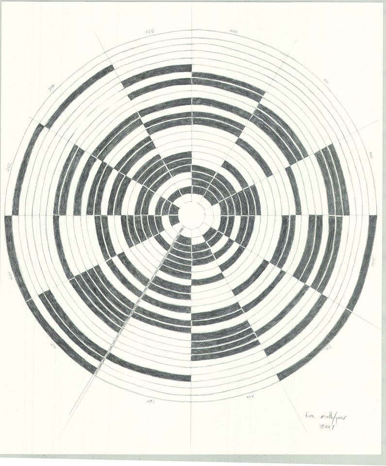 "Annette Lawrence’s studio practice is characterized by transforming raw data into drawings, objects, and installations. The data accounts for and measures everyday life. Her subjects of inquiry range from body cycles, to ancestor portraits, music lessons, unsolicited mail, and journal keeping. She addresses questions of text as image, and the relationship between text and code. Her work is grounded in examining what counts, how it is counted, and who is counting. Her process is one of making and unmaking, looking, waiting, recognizing things that go unannounced and remain steady, continuous, and unremarkable on the surface, but hold magic over time."