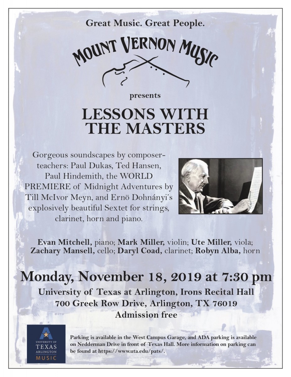 Mount Vernon Music invites the public to “Lessons with the Masters” on Monday, November 18 at 7:30 p.m. at Irons Recital Hall at the University of Arlington. A celebration of those whose creative genius applied also to teaching, the program showcases music by composer-teachers from the Romantic Era to the present day, including a world premiere by Texas Christian University professor of composition Till MacIvor Meyn, who will narrate his new musical story Midnight Adventures, written for Mount Vernon Music. Also on the program will be pieces by Paul Dukas (who wrote The Sorcerer’s Apprentice), Paul Hindemith, Ted Hansen, and Ernö Dohnanyi.