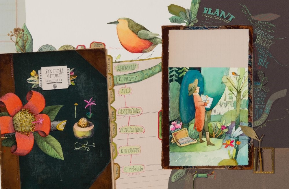 This exhibition features original works of art created by acclaimed author and illustrator, Melissa Sweet. Sweet has illustrated over 100 books and is the recipient of a Caldecott Honor in 2009 for A River of Words: The Story of William Carlos Williams and in 2015 for The Right Word: Roget and His Thesaurus both by author Jen Bryant. As an author, Sweet has written four books; her most recent, Some Writer! The Story of E. B. White garnered two nonfiction awards: the 2017 NCTE Orbis Pictus Award and a Boston Horn Globe Book honor. Sweet's illustrations combine watercolor, mixed media and collage, often incorporating wood, hardware, vintage office supplies, wallpaper, fabric and text into the composition, inviting careful inspection by the reader/viewer and rewarding us with enchanting and insightful connections to the subject matter.