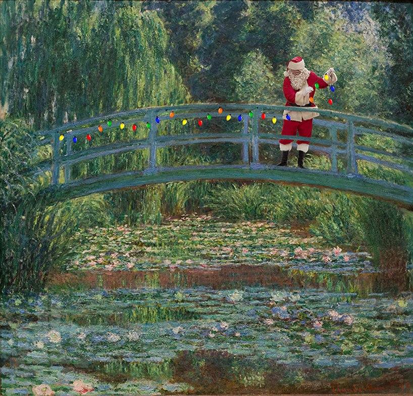 Over the years, Ed Wheeler has researched hundreds of paintings and found that certain compositions beckon to him for a “Santa intervention.” Often Santa replaces a main figure in a painting; sometimes he is added to a group composition or he may even be the single human presence in a landscape. Ed’s intent is to pay homage to the original paintings while offering art lovers an additional reason to smile. Once a painting is selected, he embarks on a multi-step process to fully integrate Santa into the lighting, brushstrokes and tonal values of a particular painting while maintaining the fidelity of the original.