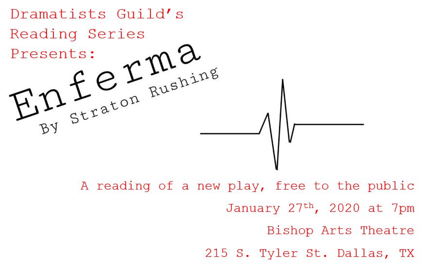 The Dramatists Guild of America will be featuring "Enferma" by Straton Rushing as a part of the Monday Night Footlights new play reading series. The reading will take place at the Bishop Arts Theatre Center (215 S. Tyler St. Dallas, TX ) at 7pm.