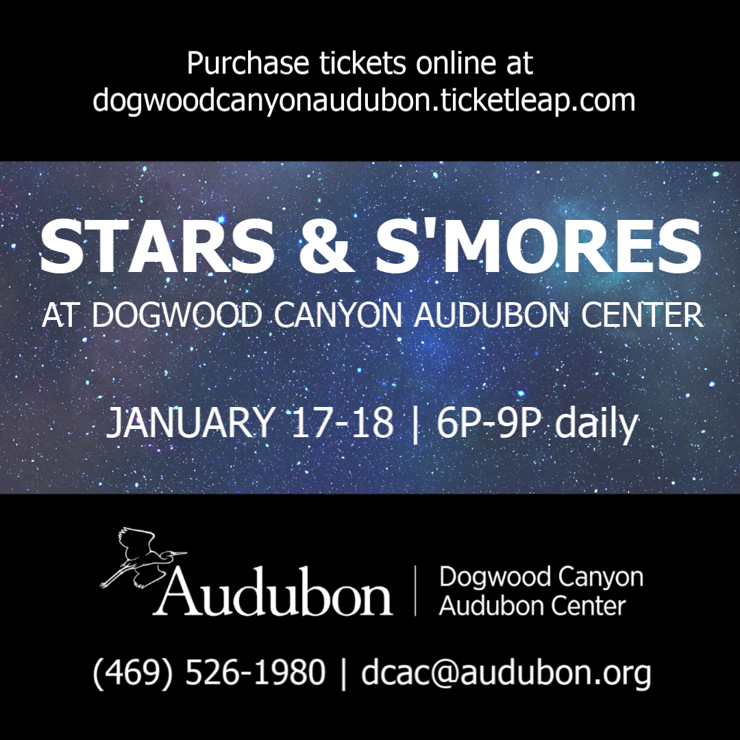 Come see the stars, hear the owls, and explore Dogwood Canyon at night. We’ll roast s’mores around the campfire and telescopes will be available for night sky viewing (weather permitting). Guided night hikes are available for all-ages and longer hikes for adults only. Animal encounters also available for an additional nominal fee. Plus, we’ll have hot chocolate, lawn games, kids’ crafts, and exclusive discounts available in our gift shop. Because this event has sold out in the past, we have expanded to two evenings. Choose to join us either Friday, January 17 or Saturday, January 18. Purchase tickets ASAP to ensure availability and to guarantee space on a guided hike or in an animal encounter.