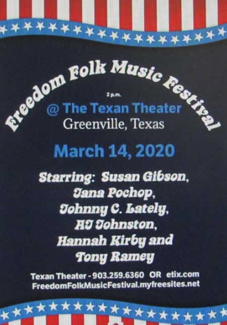 We are doing a folk music festival on March 14th at the incredibly beautiful Texan Theater in Greenville Texas. We will be showcasing Jana Pochop, Tony Ramey, AJ Johnston, Johnny C. Lately, Hannah Kirby and Susan Gibson. It should be lots of fun and the Texan Theater is extraordinary! You can spend the afternoon listening to some of the best local folk music talent out there today. I venture to guess you will hear a little of everything music-wise. It will be a good time. There will be good food and drink and a nice relaxed atmosphere in which to spend time with your friends and family.