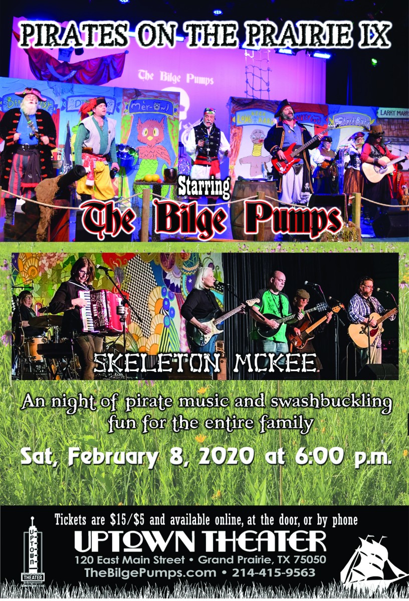 The event will take place at the Uptown Theater, located at 120 E. Main Street in downtown Grand Prairie. Lobby doors will open at 5:00 p.m., theater doors at 5:30, Skeleton McKee starts at 6:00, then the Bilge Pumps at 7:15.