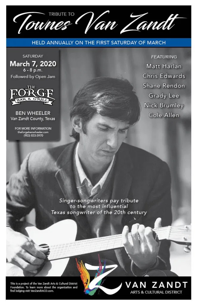 For more information on the Tribute to Townes Van Zandt March 7 at The Forge Bar & Grill go to theforgebenwheeler.com or call (903) 833-5970.