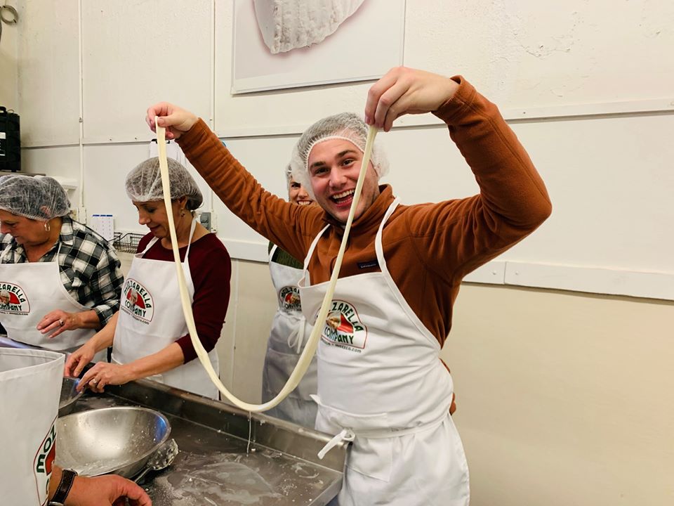 Upon arrival, students dress to make cheese by donning aprons and hairnets. The event begins with a behind-the-scenes tour of the cheese factory. Once the tour is complete, the hands-on cheesemaking course begins. Participants will first learn how to make Fresh Ricotta and scoop it into baskets. Next, the participants are given a block of Fresh Mozzarella Curd, and they learn how to stretch and form many varieties of Mozzarella such as balls, Bocconcini, Mozzarella Rolls, and Queso Oaxaca.