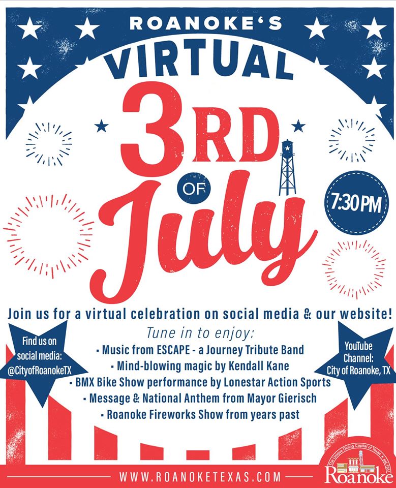 We are excited to announce Roanoke's first ever VIRTUAL 3rd of July Experience! On July 3rd, you'll be able to tune in live at 7:30 PM on Roanoke's social media and website to enjoy: