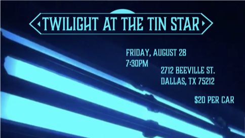 Twilight at the Tin Star - August 28 at 7:30 PM at the Tin Star Theater in Trinity Groves located at 2712 Beeville St, Dallas, TX 75212. Show starts at 7:30 PM. Gates open at 7:00 PM. Tickets will be available at the gate at a cost of $20 per vehicle.