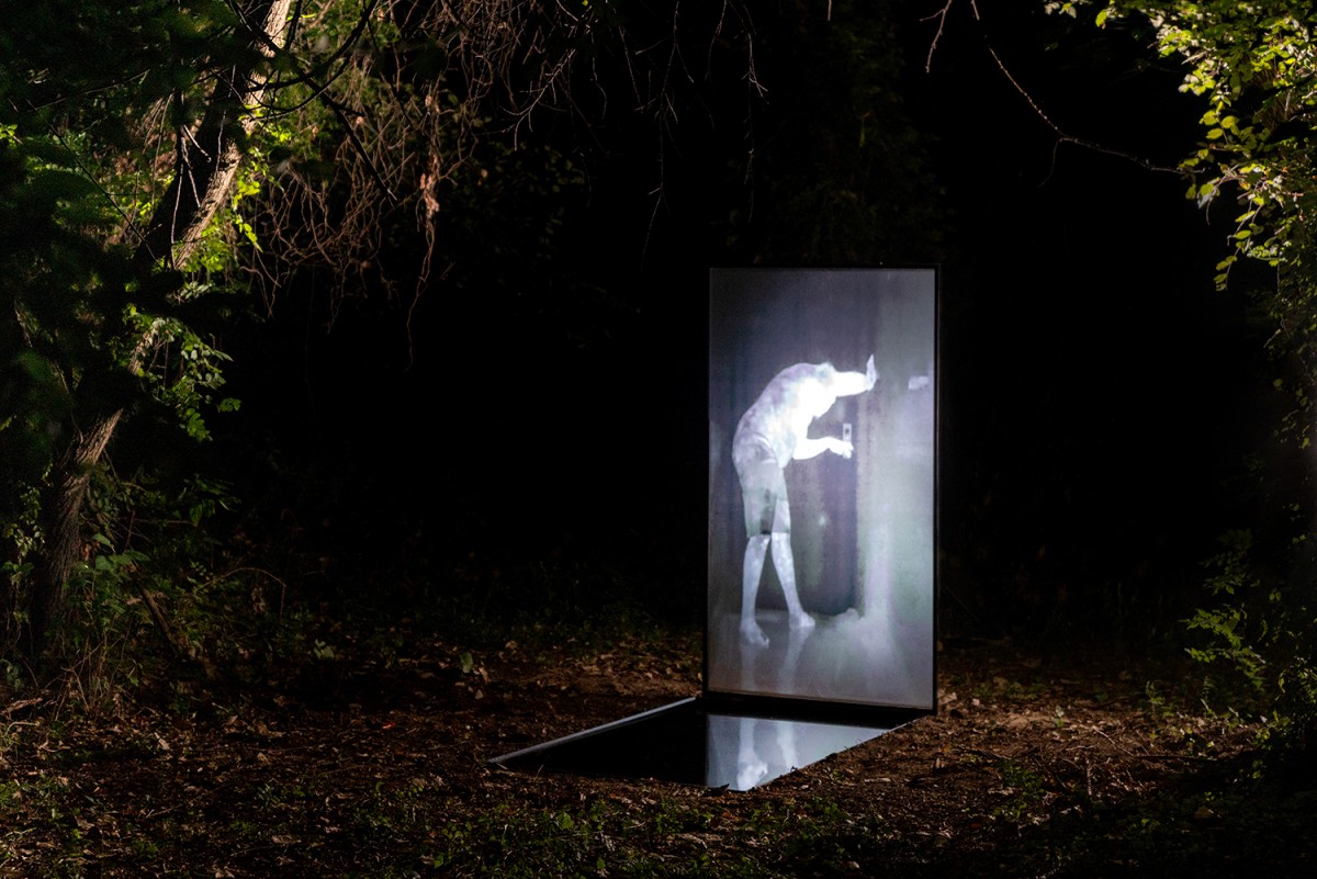 Breath Ascent Reveal is a nighttime video installation by New York-based sculptor Asif Mian. Tucked under the trees, a looping projection sits over a shallow pool which serves as a plinth, doubling the digital image and reflecting the surrounding park - the screen standing as both monument and intimate cinema.
