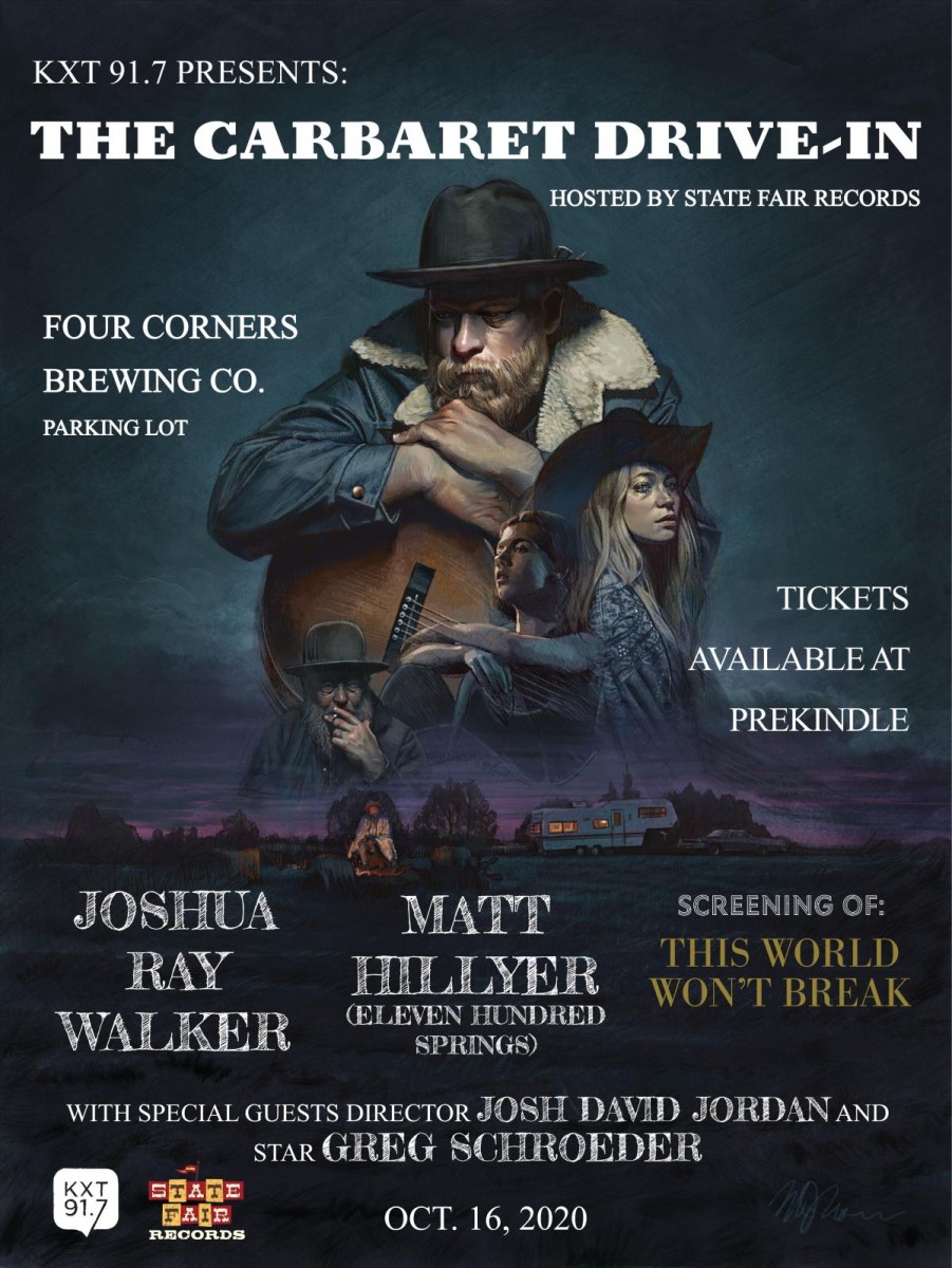 Join KXT at Four Corners Brewery on Friday, October 16 for a special “Carbaret" with State Fair Records! From the safety of your car, enjoy solo performances by Joshua Ray Walker and Matt Hillyer of Eleven Hundred Springs. Following the music will be a screening of the critically acclaimed film This World Won’t Break, by local filmmaker Josh Jordan. Price is $30 per car. This event is for all ages.