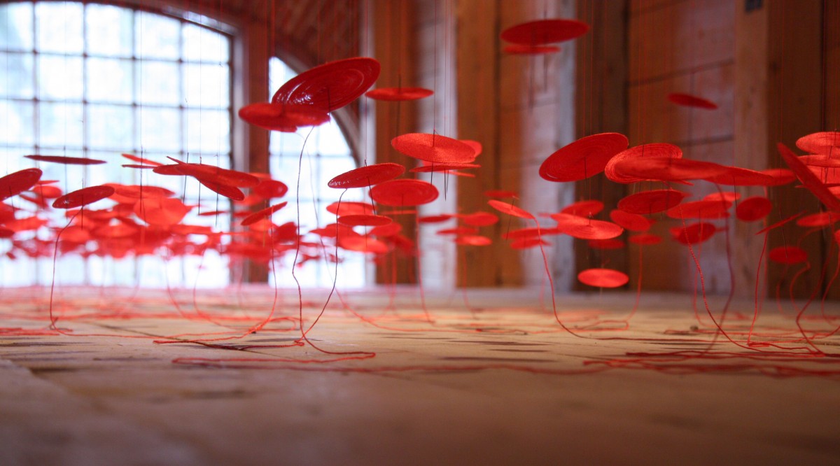 The installation makes use of thousands of hand-coiled disks of red thread, each pierced at the center by a single sewing needle, enabling its suspension from the ceiling. A disk may be connected to another, as a pair; and a pair of disks is made from a single thread. Subtle air currents set the red thread coils swaying and turning slowly as the loose strands of thread on the floor drift and become entangled.