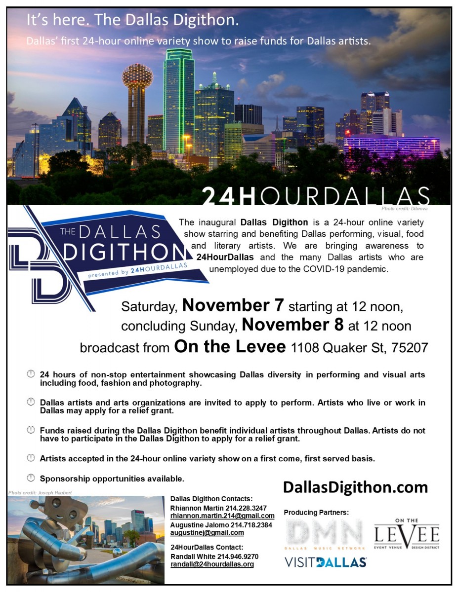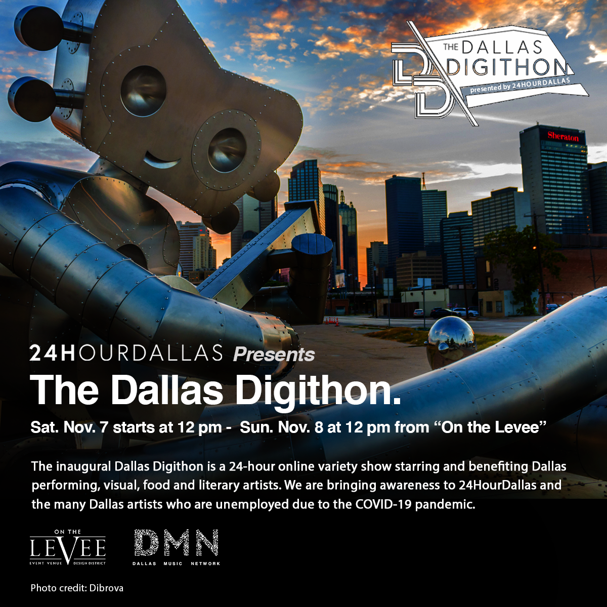 24HourDallas – the non-profit organization dedicated to creating a safe, vibrant and diverse nighttime culture for businesses, residents and guests – debuts Dallas Digithon, the first 24-hour online streaming variety show November 7 and 8 starting at 12 noon broadcasting from On the Levee, 1108 Quaker Street 75207 and benefiting Dallas artists. Viewers can tune in at www.DallasDigithon.com.