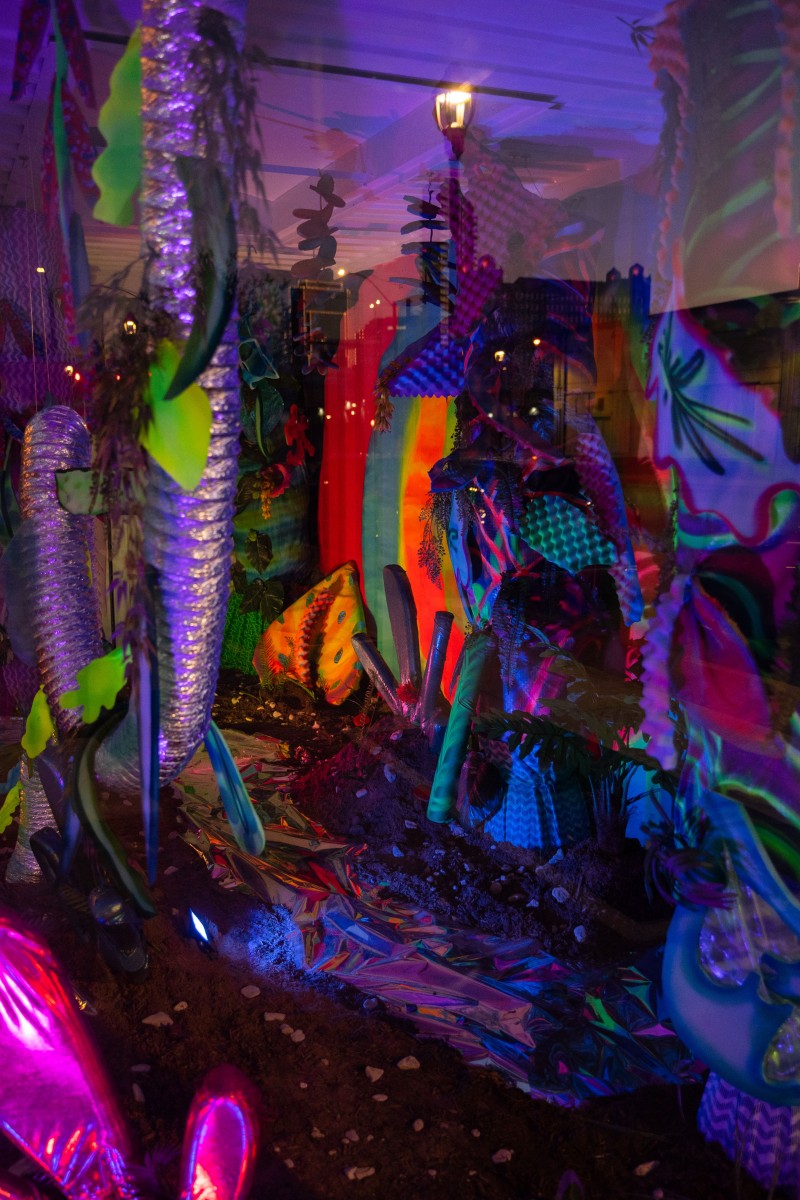 Mariell Guzman's and Tyler Germaine's new project located in the Art SouthBox curated by Art Tooth in Fort Worth’s SoMA district. It's an interactive installation titled “Synthetic Aesthetic” that will transplant patrons to a technicolor jungle without the hassle of traveling internationally.