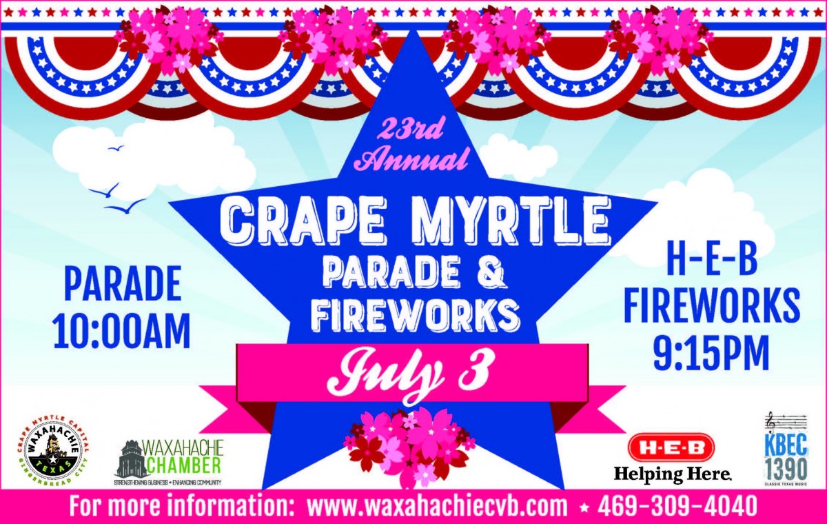 The Crape Myrtle Parade & Fireworks are FREE to the public. Sponsors include: H-E-B, Crape Myrtle Council, Waxahachie Chamber of Commerce and the City of Waxahachie.
