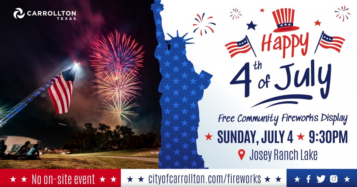 In honor of Independence Day, the City of Carrollton will host a 15-minute community fireworks display over Josey Ranch Lake (1700 Keller Springs Road), scheduled to start at approximately 9:30 p.m.