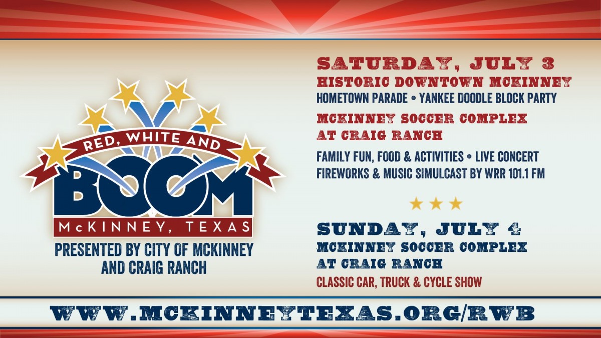 All Red, White and BOOM! activities are free and open to the public. For more information about the event call 972-547-7480. Red, White and BOOM! is presented by the City of McKinney and Craig Ranch.