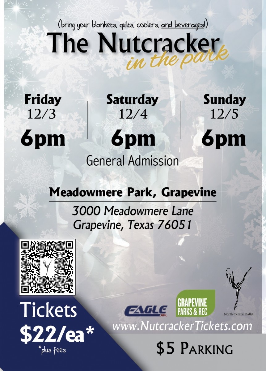 Take a magical journey through the Land of Snow to the Kingdom of the Sweets to visit the Sugarplum Fairy. North Central Ballet's 27th annual production of The Nutcracker will be presented outdoors in Meadowmere Park, December 3-5.