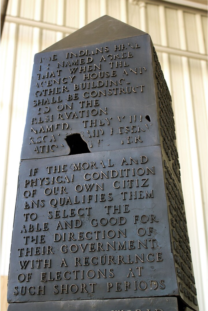 North Texas–based artist Darryl Lauster’s Testament (2018–20) will inaugurate a series of outdoor creative projects implemented by the Carter. Through the examination of America’s past and present, Lauster’s bronze obelisk calls for the viewer to be a critical reader of information and to look at the function of text in different contexts. Testament combines pop culture references with quotes from primarily U.S. foundational documents bringing to question what we know about our nation’s history and promises.