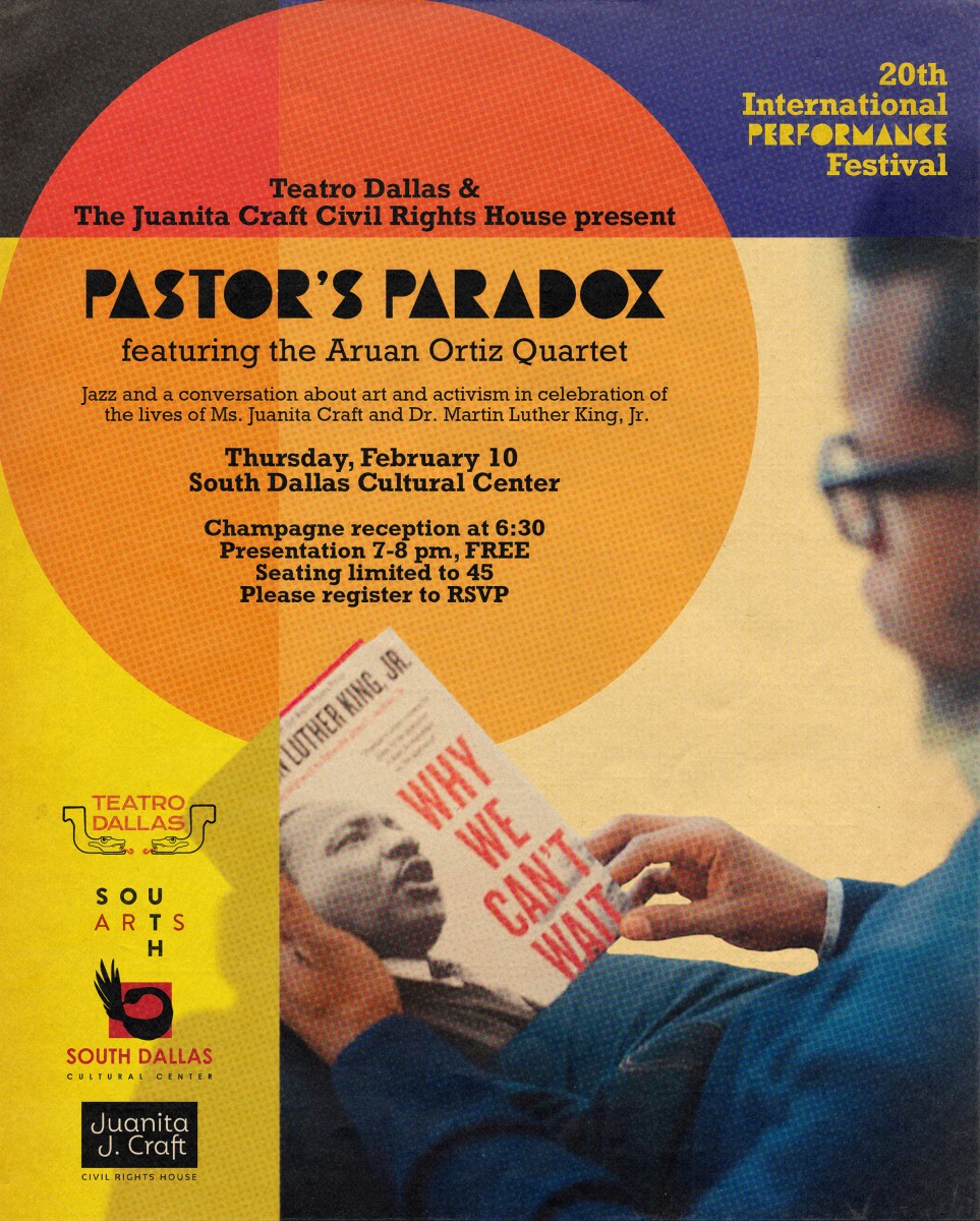 As part of our 20th International Performance Festival, Teatro Dallas and The Juanita Craft Civil Rights House presents Cuban-born jazz pianist Aruán Ortiz and his quartet in a world-premiere 50-minute piece (in five movements) called “Pastor’s Paradox.”