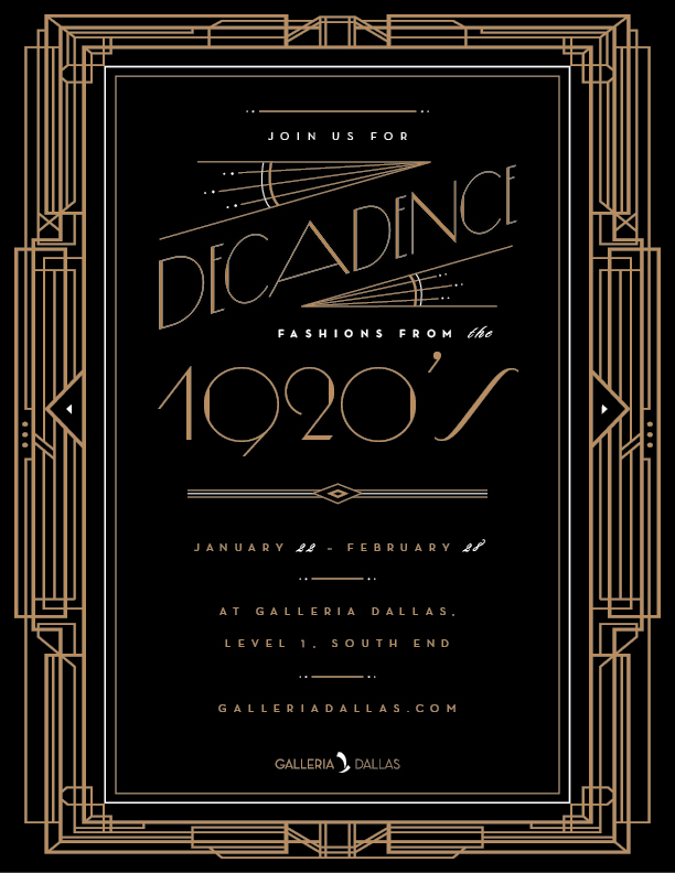 Presented by Galleria Dallas, curated by Ken Weber of Vintage Martini and featuring pieces from the Susan Denn and Robert Schmidt Collection and The Texas Fashion Collection of UNT College of Visual Arts & Design, Decadence will showcase the allure of the 1920s in fashion and accessories.