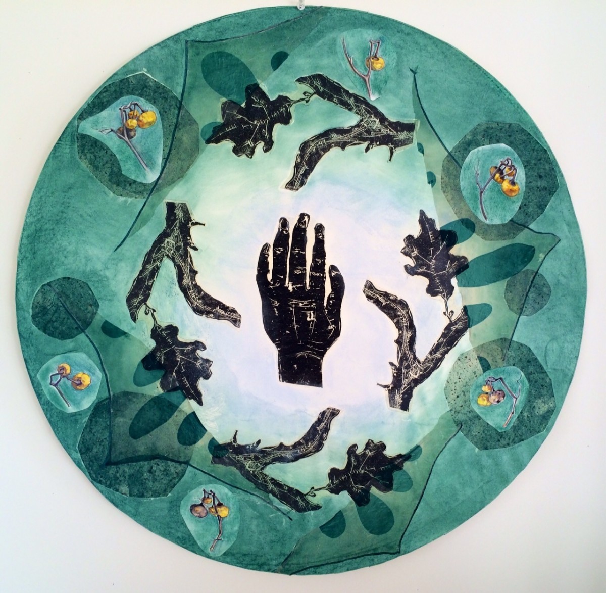 In addition to the artists’ individual work, Mersky and Ivey present an experiment in collaborative work, drawing from a wide array of images, including specimens from BRIT’s Herbarium. These circular works embody the idea of Call and Response. Each of these pieces was sent back and forth between the artists with additions and deletions made in each studio using collage, printing, drawing, and painting.