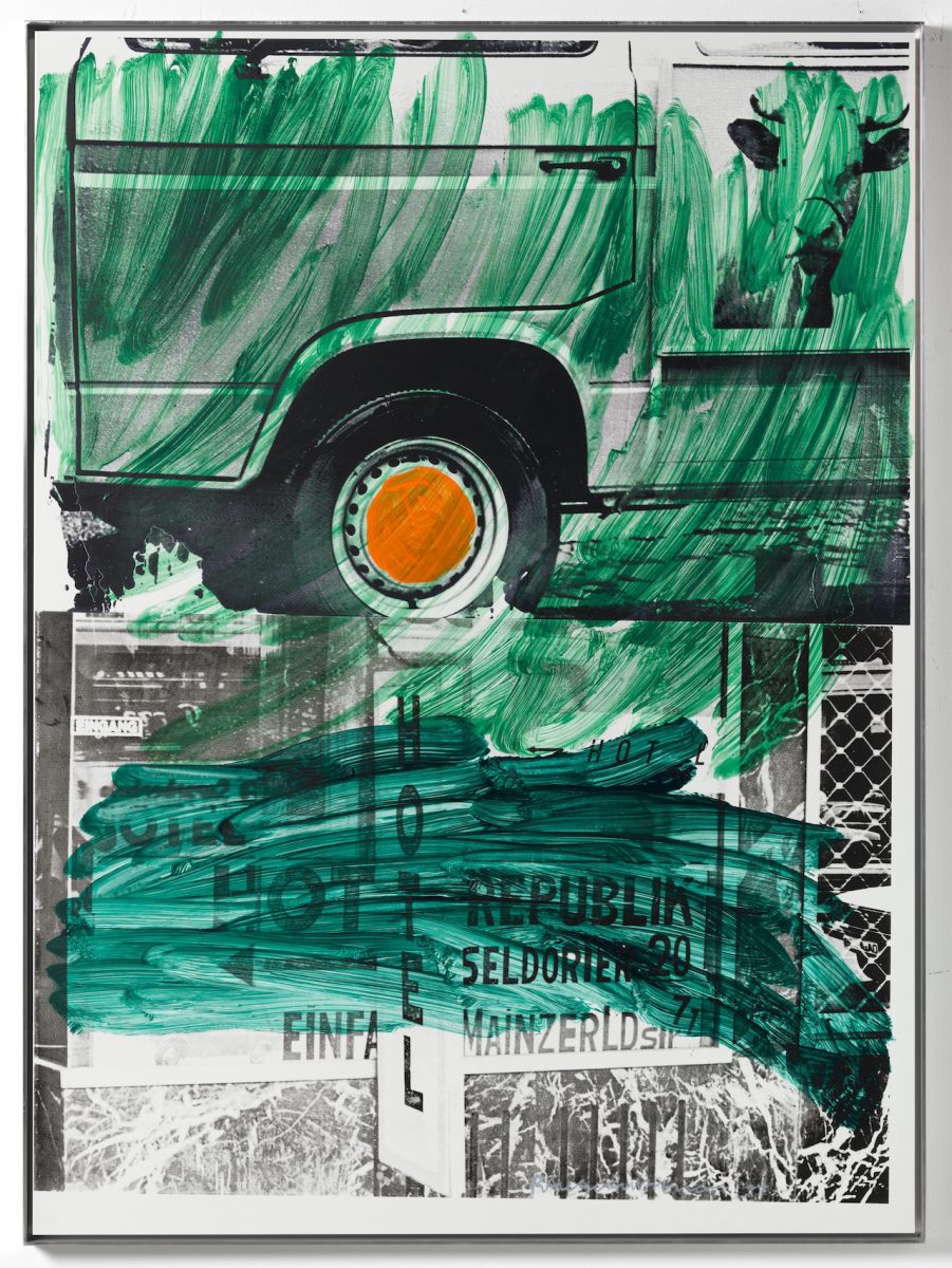 PARIS TEXAS picks up where Paris, Texas leaves off. Born in Port Arthur, Texas, Robert Rauschenberg understood that our inner mental worlds are built of images from the outer world, things like ads, street signs, and store items, all rather messy and unruly. One sees this in his Grass Hotel (Urban Bourbon) (1994) where images of a van, cow-head, and hotel façade are made to dance upon one another via his trademark screenprint technique.