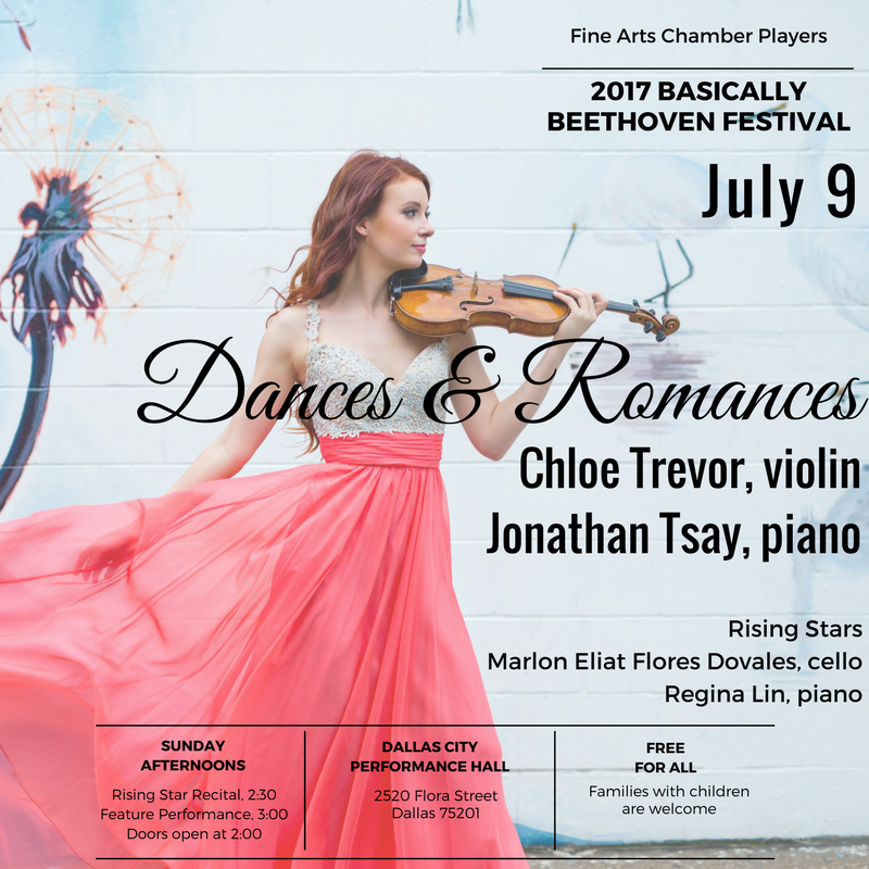 Fine Arts Chamber Players will present the free 37th annual Basically Beethoven Festival on Sunday afternoons in July. Held at the Dallas City Performance Hall in the Dallas Arts District, every program starts with a Rising Star Recital at 2:30 p.m. followed by a Feature Performance at 3 p.m. Rising Star Recitals present local, gifted young musicians. Feature Performances showcase professional musicians from the area.