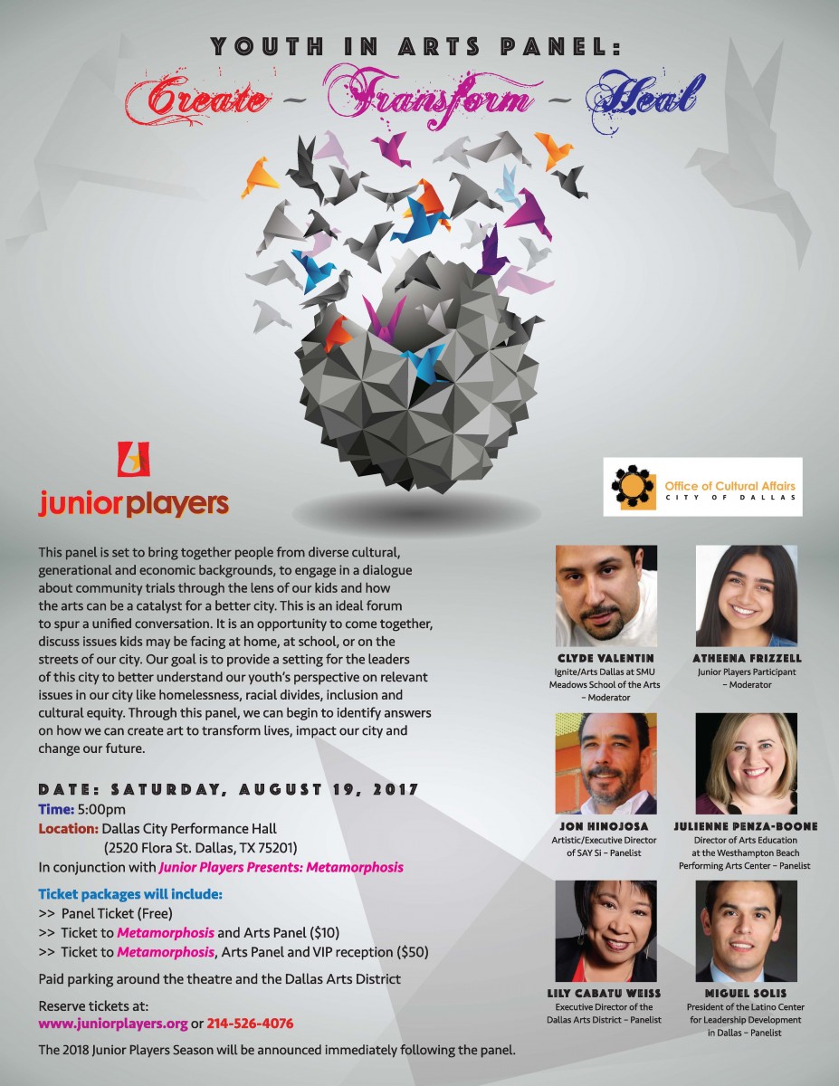 Junior Players will host a free panel discussion on August 19, 2017, at the Dallas City Performance Hall focusing on cultural and racial equity within the Dallas art community and how the city’s youth can become catalysts for change in ensuring an equitable arts environment. The panelists represent a wide range of disciplines and come from diverse communities across the nation.