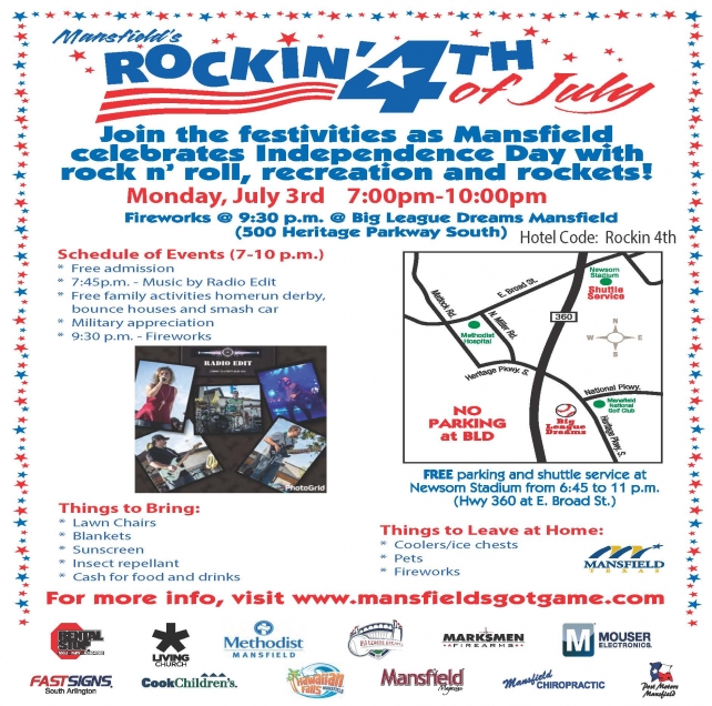 Mansfield’s annual Independence Day celebration focuses on recreation, rockets and rock n roll. Held at Big League Dreams Mansfield Sports Park, the free event features family activities, live music, food, and fireworks. Free shuttles are provided from Mansfield ISD’s Newsom Stadium.