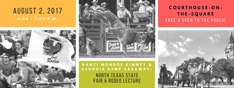 Join us from 6:00 - 7:00 p.m. on August 2 at the Courthouse-on-the-Square for the next installment of our lecture series! Nanci Monroe Kimmey, Gerogia Kemp Caraway, and Mickey McNary will be discussing the history of the North Texas State Fair and Rodeo.