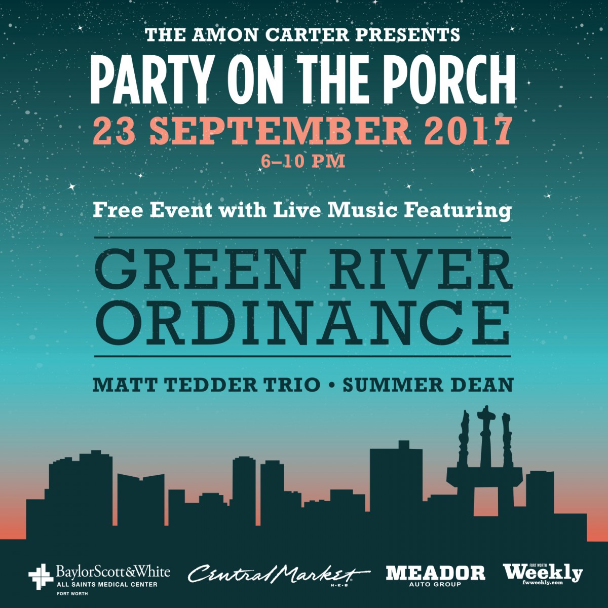 Party on the Porch features live music by hometown artists, kicking off at 6:30 p.m. with the self-styled “AmeriTonk” sound of the soulful country artist Summer Dean. She is followed by the Matt Tedder Trio, whose music blends classic rock, blues, and modern folk. Headlining the event is Green River Ordinance with their sound of country, rock, pop, and folk. Local food trucks, lighting effects on the building, screenprinted T-shirts, lawn games and a special area reserved for Amon Carter members are back by popular demand. Beer and wine will be available for purchase throughout the evening. Gallery and museum store hours have been extended until 9 p.m. Docents will be on hand giving tours, and artmaking will also be offered. Free parking is available at the UNT Health Science Center lot and east garage on Clifton Street.