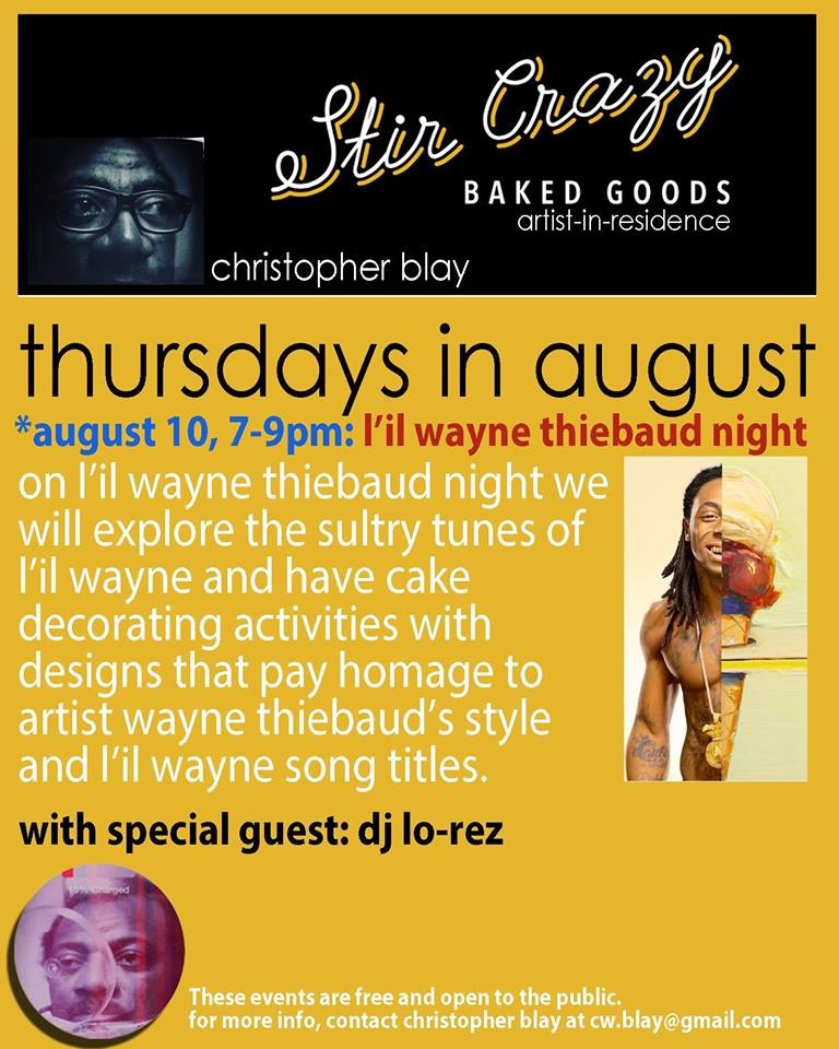 1.) August 10: L’il Wayne Thiebaud Night. On L’il Wayne Thiebaud night we will explore the sultry tunes of L’il Wayne and have cake-decorating activities with designs that pay homage to artist Wayne Thiebaud’s style and L’il Wayne song titles.