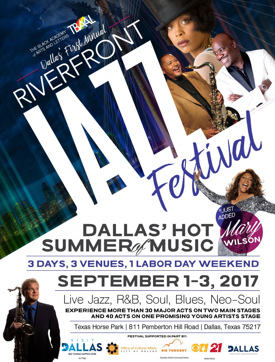 Dallas' first annual Riverfront Jazz Festival, presented and produced by The Black Academy of Arts and Letters (TBAAL), will host national music artists and highlight the city's charm and unique, diverse culture on Labor Day Weekend, September 1-3, 2017 on three stages at the stately Horseshoe Park, 811 Pemberton Hill Road.