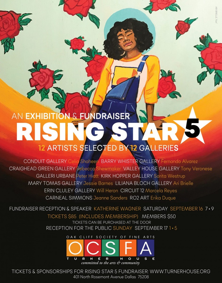The Oak Cliff Society of Fine Arts – Turner House will present its fifth Rising Star exhibition and fundraiser September 16 and 17 at the historic Oak Cliff home. Twelve prestigious Dallas galleries have each nominated one emerging Texas artist who is not yet represented by a gallery to be in the group show.