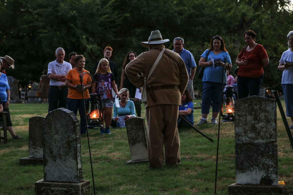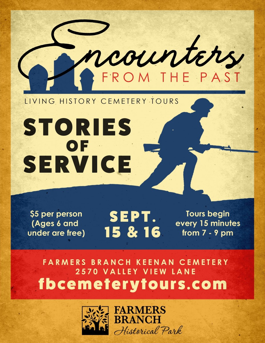 Encounters from the Past, living history cemetery tours, will be focused on a new theme this year: Stories of Service. With a dozen vignettes focused on those citizens who served the Farmers Branch, Carrollton, and North Texas communities in substantial ways, the 2017 tours will take guests from the founding of Texas through the 1970s. You and your family will have a chance to meet a World War I aeroplane pilot, a World War II nurse (and the only woman from our area to serve in the armed forces during that conflict), not to mention school teachers, firemen, mothers, preachers, and more as costumed actors take on the roles of these prominent citizens during an evening of storytelling, history, and family fun.