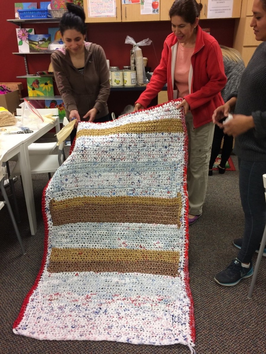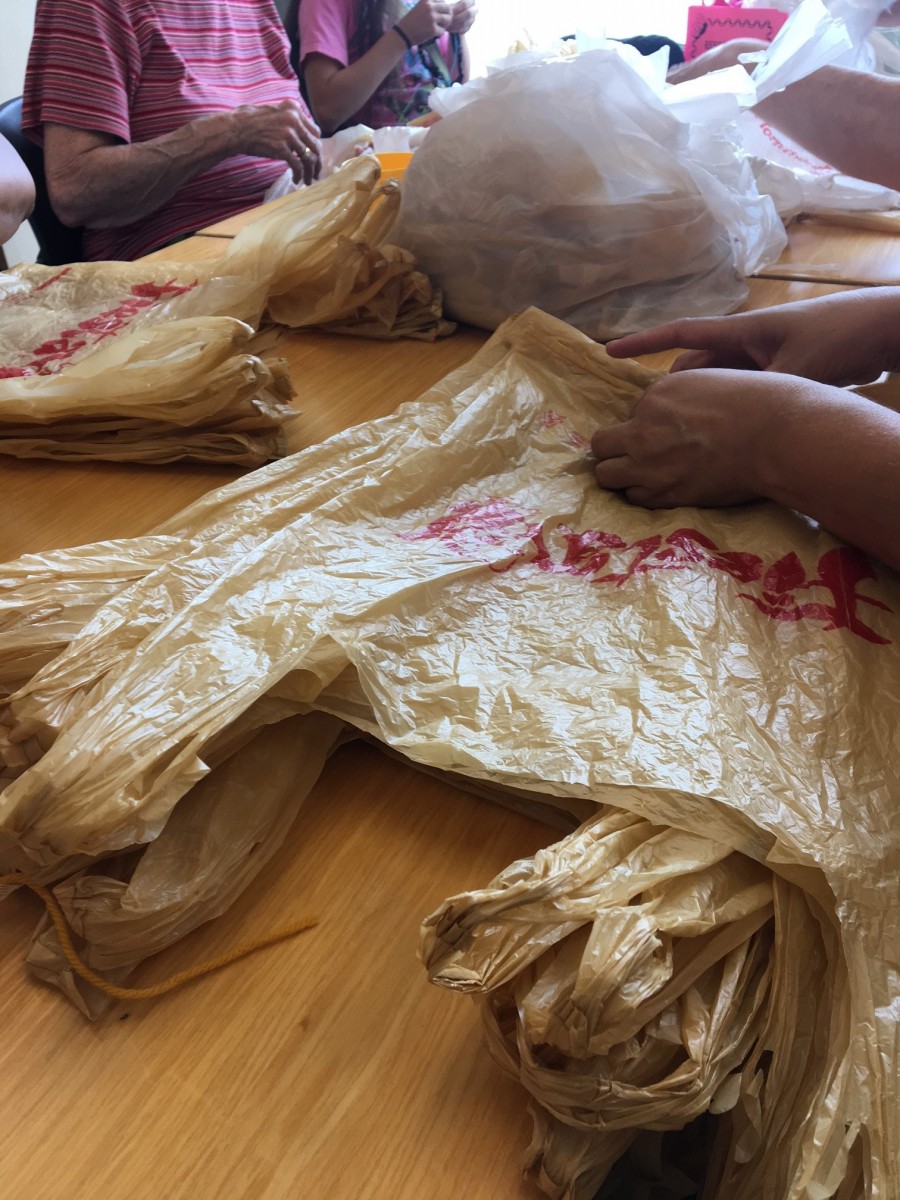 Estamos haciendo mantas de bolsas recicladas para dar a las personas en nuestra comunidad que las necesitan.
