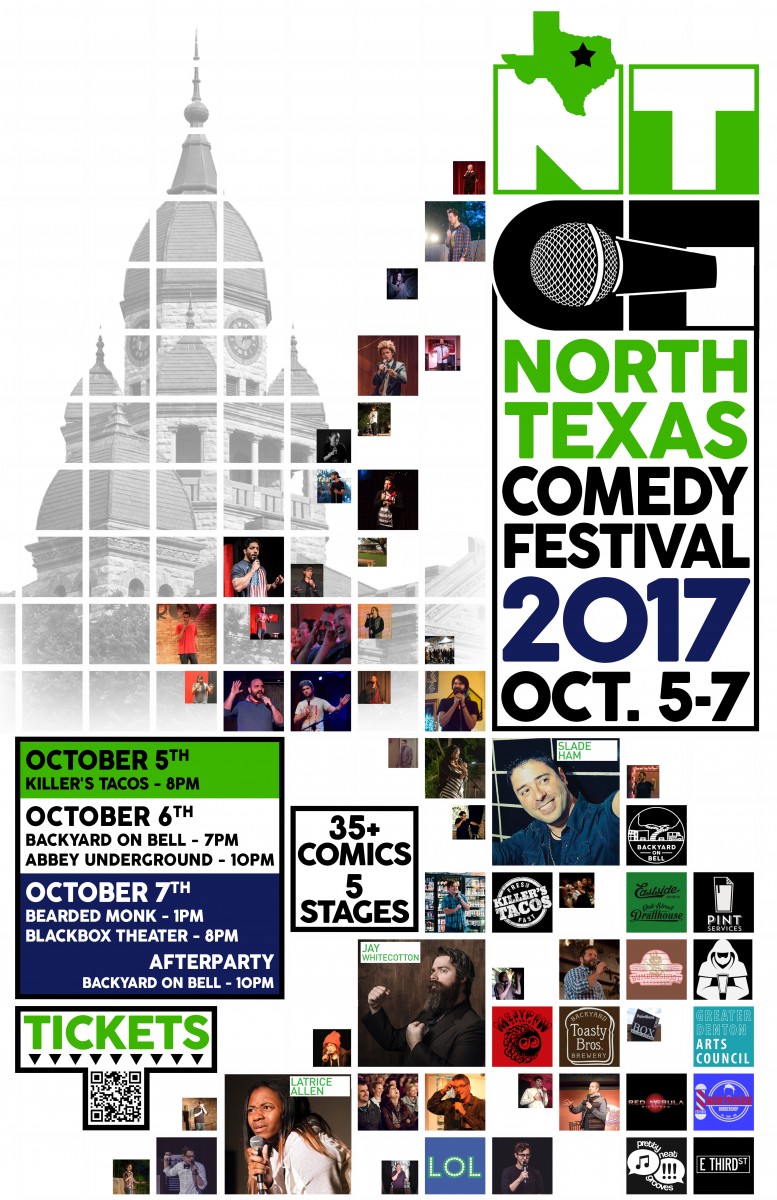 Five beloved venues, three top-notch headliners, and fourteen mainstay North Texas sponsors are bringing you the NORTH TEXAS COMEDY FESTIVAL October 5-7. 35% of all festival proceeds benefit charity, so every ticket sale and sponsor contribution benefits the advancement of literacy and the distribution of children's books to those most in need. Don't miss the first annual NT Comedy Fest!