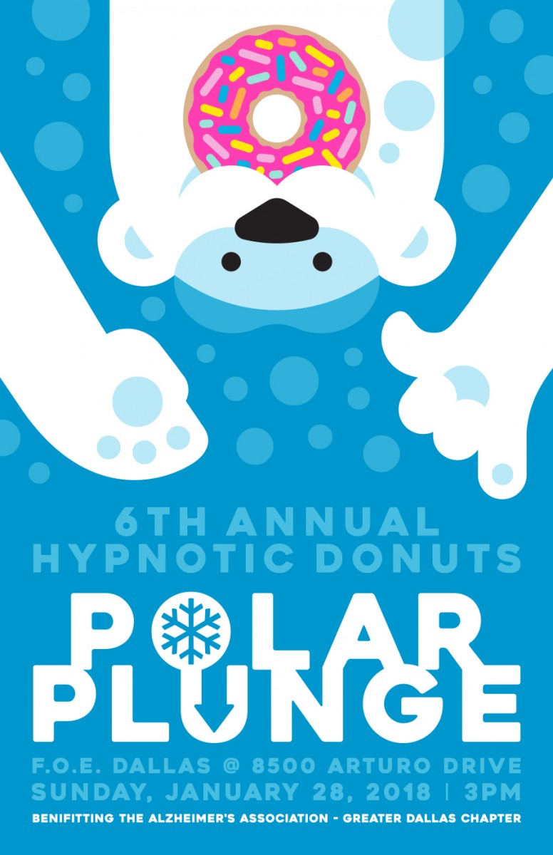 The Polar Plunge will take place at the pool of the Dallas Fraternal Order of Eagles 3018, on Sunday, January 28th, 2018. Doors open at 3:00 PM. Jump starts at 4:00. Pay $10 to jump into the pool and then warm up in the FOE’s heated Tiki Bar area afterwards. Spectators and donations are definitely welcome. New this year is the 4 person relay race. Winners of this race will each get a free day swim pass. A raffle will also take place for an office brunch catered by Hypnotic Donuts. All donations raised will go to the Greater Dallas Chapter of the Alzheimer’s Association. Emergency Ice will again be providing snow for everyone to enjoy in the kids’ play area. Food and drinks can be purchased at the FOE throughout the event.
