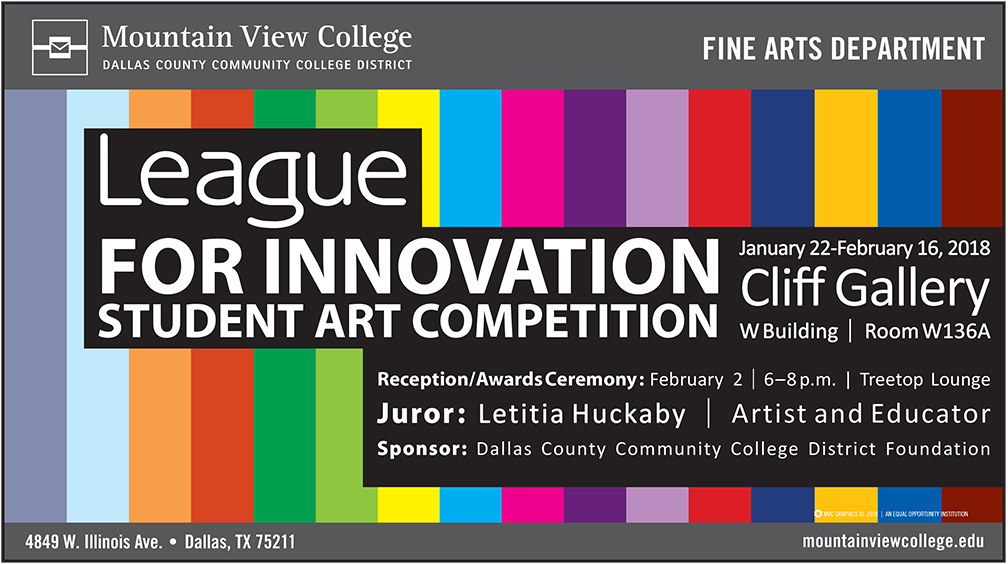 Dallas County Community College District Foundation is sponsoring League for Innovation Student Art Competition. This competition will take place at the MVC Cliff Gallery from January 22- February 16. The art will be judged by artist and educator Letitia Huckaby.