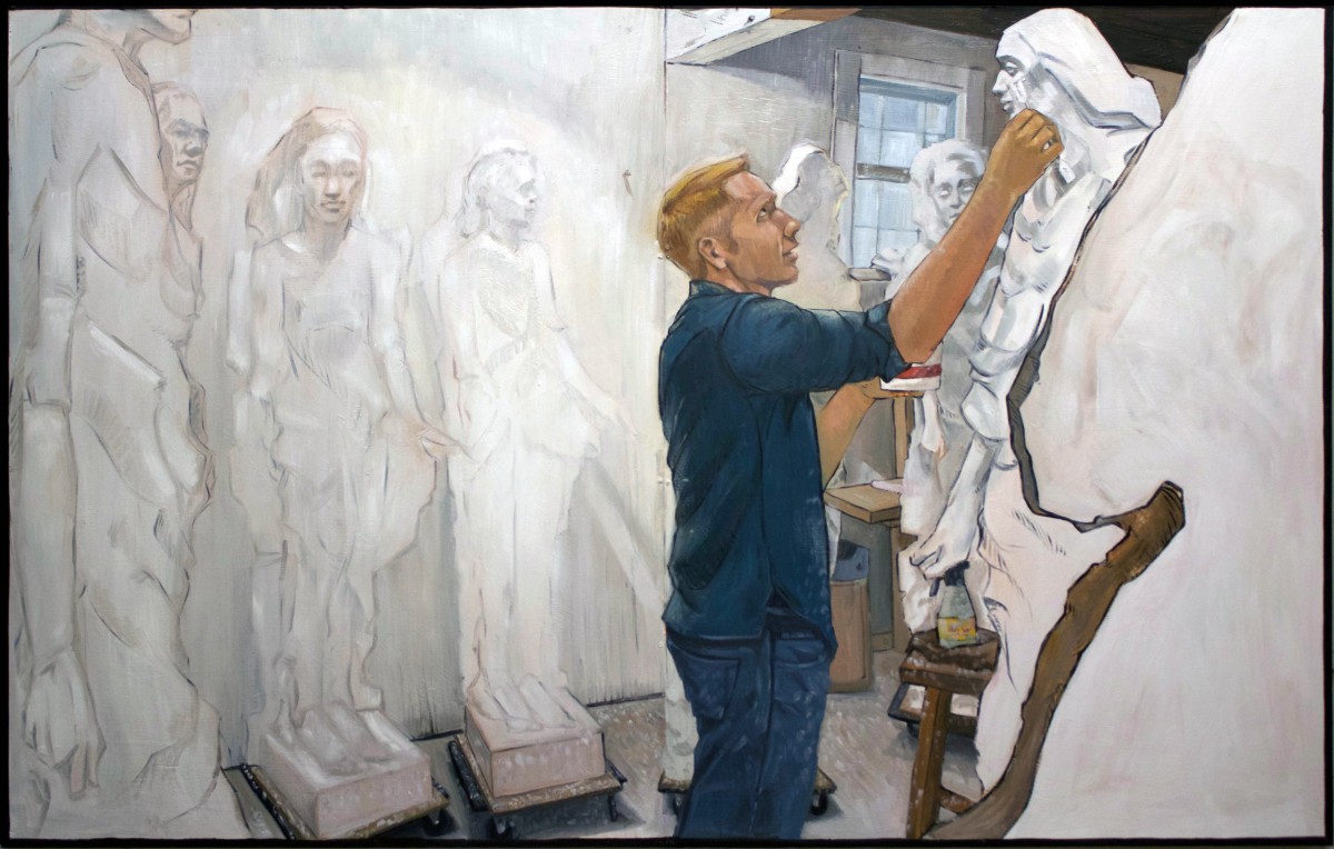 Riley Holloway is a Dallas based figurative and portrait painter. The Hunting Prize finalist studied painting at the Art institute of Dallas and the Florence Academy of Art in Florence, Italy. His exhibition “Riley Holloway: The Artists” focuses on paintings of artists in their studios. Holloway writes about the studio process of artists: “This body of work is to document that process, that moment of action, or dialogue between the artist and their work. [Private] moments that I’ve been given the privilege of observing. This is my attempt at sharing those moments with the viewer."