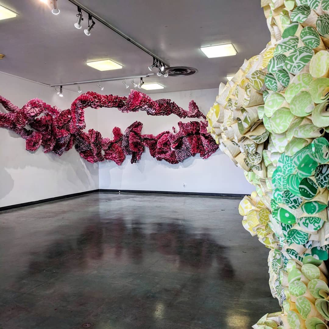MANipulations, MANifestations, and MASTERship by Abhidnya Ghuge is now on view at Fort Worth Community Arts Center. This group of work is site specific installation created using humble materials such as poultry fencing and woodblock printed paper plates, along with a few wall mounted art works showcasing the woodblock printed paper plates and carved wood. A large scale hand carved woodblock will also be on display. The installation will engage the viewers as they walk around it and through the installation.