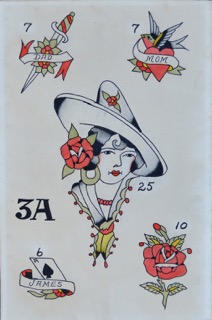We met Max from a box set book he sent us a while back. It was sincere and full of great art and made us feel like we had known him forever. We finally talked him into visiting us in Texas and talked him into showing his work here. They are collages and paintings/drawings from this kind fella who is a modern day traveler and tattoo artist. We love them!& vintage tattoo flash from the Jonathan Shaw collection.