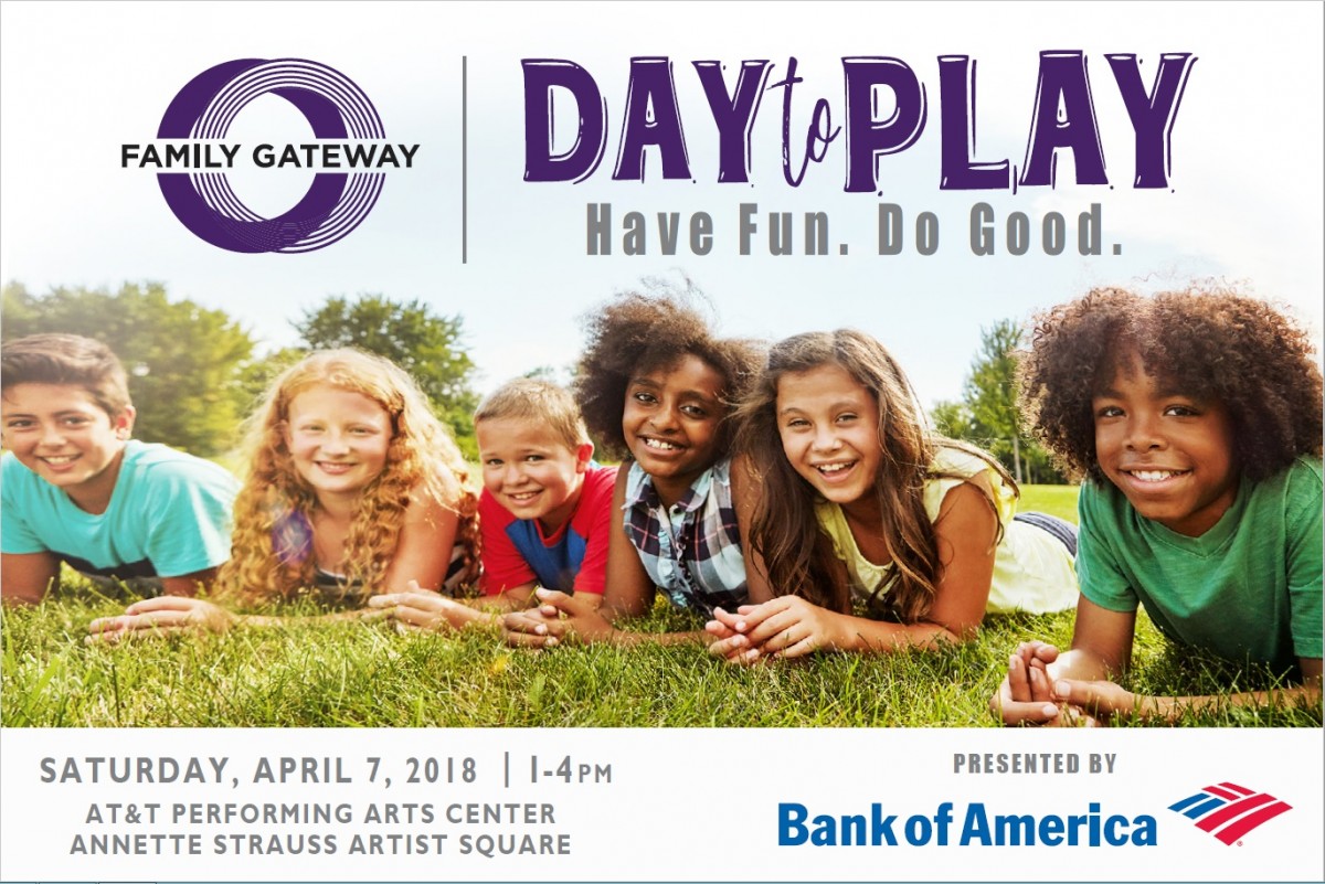 Family Gateway will host its first family fundraiser, DAY to PLAY, presented by Bank of America, on Saturday, April 7, 2018, from 1 to 4 p.m. at AT&T Performing Arts Center’s Annette Strauss Artist Square, honoring the late founder of Family Gateway, former Dallas Mayor Annette Strauss. The simple purpose of the event is to give children a day to just be kids - to make new friends and have fun while offering parents the opportunity to introduce or reinforce the importance of helping others. Event leadership includes Honorary Chairs Marlene and John Sughrue, Event Co-Chairs Lara Wilhelm-Harrison and Steve Harrison, and Event Co-Chairs Eddie Maestri and Adam Moore.