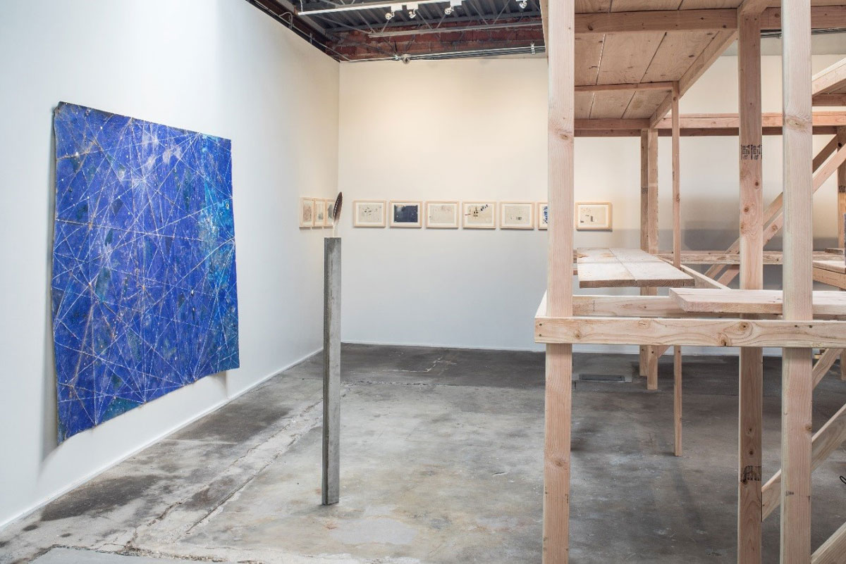 True to Cordova’s practice, ankaylli: spatial and ideological terrainfeatures a geometric form that is fundamental to nature and has appeared across cultures and times, from prehistoric carvings to pre-Columbian aqueducts to the artist Robert Smithson’s Spiral Jetty. The installation’s multifarious components circulate on and around the spiral form, directly referencing pre-Columbian traditions, modern art, and the cosmos, three “territories” that are often thought of as distinct but that here overlap, as indeed they do in Marfa.