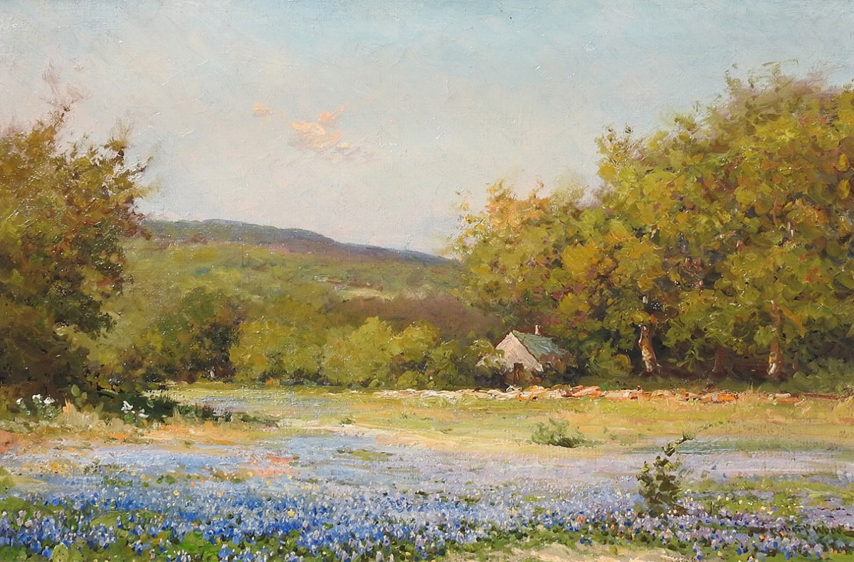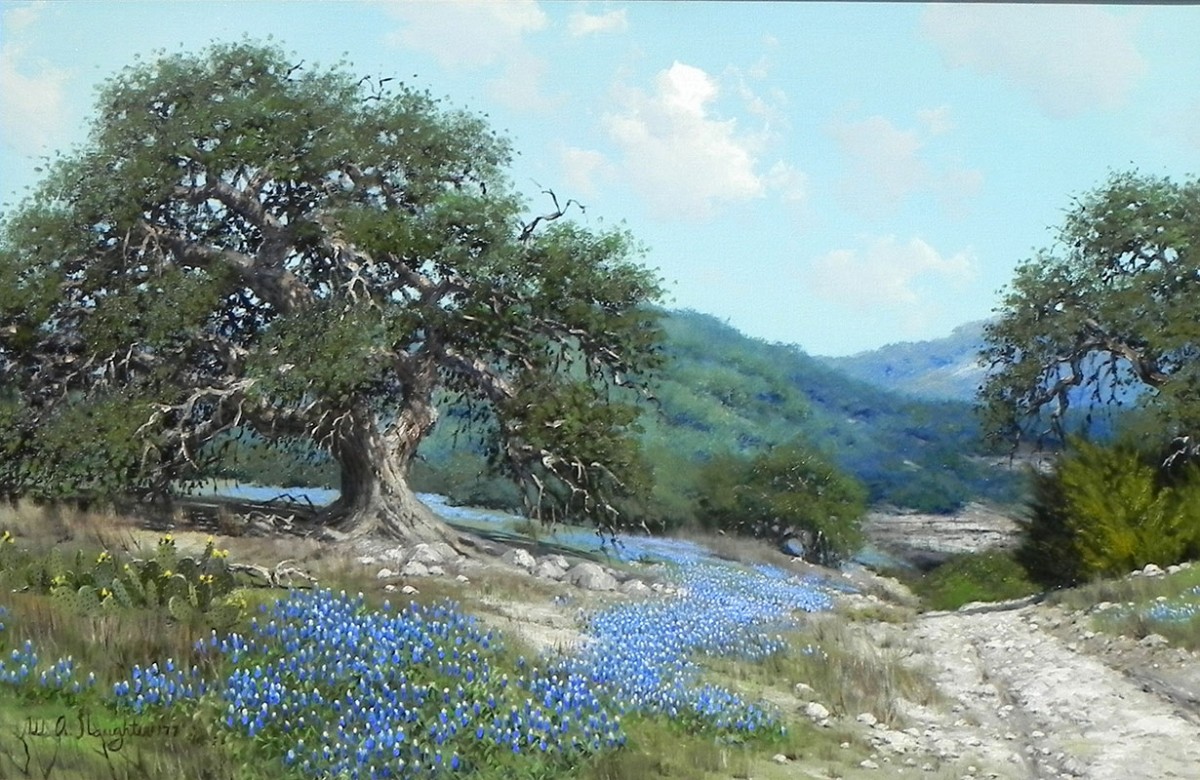 W.A. Slaughter (1923-2003) is best known for this glorious Texas landscapes blanketed in bluebonnets with magnificent Texas live oaks. He is considered a bluebonnet master.